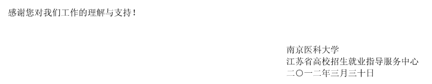 尊敬的用人單位: 為促進(jìn)我省醫(yī)藥衛(wèi)生類畢業(yè)生充分就業(yè),江蘇省高校招生就業(yè)指導(dǎo)服務(wù)中心、南京醫(yī)科大學(xué)定于2012年4月21日共同舉辦“江蘇省2012屆醫(yī)藥衛(wèi)生類畢業(yè)生暨南京醫(yī)科大學(xué)春季公益供需洽談會(huì),現(xiàn)將有關(guān)事項(xiàng)函告如下: |