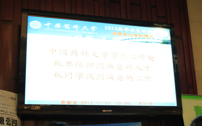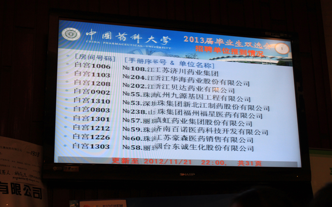 11月22日-24日,中國藥科大學2013年應屆畢業生“雙選會”在南京白宮大酒店舉行,獵才醫藥網參加了此次“雙選會”并滿載而歸。 中國藥科大學是一所歷史悠久,特色鮮明、學風優良、在藥學界享有盛譽的國家“211工程”重點建設的大學。2013年,該校將有1022名研究生,2680名本科生,290名專科生完成學業,走向工作崗位。大量的優質生源吸引了全國各地300多家企業前往招聘。獵才醫藥網對參加此次“雙選會”特別重視,獵才醫藥網作為中國百強制藥企業招聘首選的網絡平臺,期待幫助醫藥行業未來的菁英們提供一個絕佳的職業平臺。 |