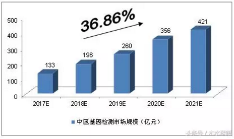 2017年我國基因檢測行業市場規模將達到133億元,未來五年(2017-2021)年均復合增長率約為36.86%,2021年市場規模將達到421億元。
