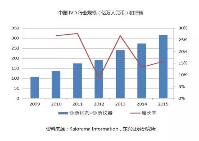 醫(yī)院主要的三方面收入為:藥品、醫(yī)療服務(wù)、政府補貼。而衛(wèi)計委和發(fā)改委已經(jīng)明確9月將取消公立醫(yī)療機構(gòu)15%藥品加成,而短時間內(nèi)醫(yī)院為了維持醫(yī)院收入,只能通過增加醫(yī)事服務(wù)增加醫(yī)院收入,而診斷正是醫(yī)事服務(wù)中重要的部分。因此IVD行業(yè)有望受益于醫(yī)改的大趨勢,長時間保持較快的增長速度。