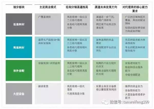 低值耗材:由 于產(chǎn)品的同質(zhì)性高,通過增加代理商以擴大產(chǎn)品覆蓋區(qū)域?qū)ΡWC產(chǎn)品出貨量尤為重要。廣泛的區(qū)域和醫(yī)院覆蓋、高效的配送網(wǎng)絡(luò)以及對醫(yī)院資源的掌控能力是代理商 的核心能力。未來,在上游廠商需求的驅(qū)動下,新型跨區(qū)域性物流平臺將快速發(fā)展,傳統(tǒng)代理商的市場份額面臨被擠壓的風(fēng)險。同時,上游生產(chǎn)商日益重視廣闊市場 的開拓,并紛紛開始布局以擴大產(chǎn)品覆蓋的地理區(qū)域,未來渠道將會進一步下沉。