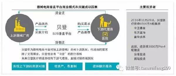 貝 登醫(yī)療的模式無疑為規(guī)模較小的生產(chǎn)企業(yè)、經(jīng)銷商以及一些小診所、民營醫(yī)院帶來福音,并且為將來“徹底打通中間渠道,一票制面向終端醫(yī)院”提供無限可能。未 來,貝登醫(yī)療可以通過收購小型代理商讓自己掌控終端資源,也可以提供供應(yīng)鏈金融服務(wù),想像空間無限。貝登醫(yī)療已于2016年11月28日,獲得來自普華資 本、中衛(wèi)基金以及東方富海的人民幣6500萬A輪融資。