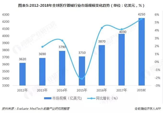 隨著全球人口自然增長,人口老齡化程度提高,以及發展中國家經濟增長,全球范圍內醫療器械市場持續增長。根據 Evaluate MedTech 統計,2017 年全球醫療器械銷售規模為4030億美元,是全球處方藥市場規模的一半,預計 2018年將達到4550億美元。行業增速方面,可以看出近年來,器械市場的增速波動較大且預計這種趨勢還將持續,期間年均復合增長率將保持在4.5%左右。