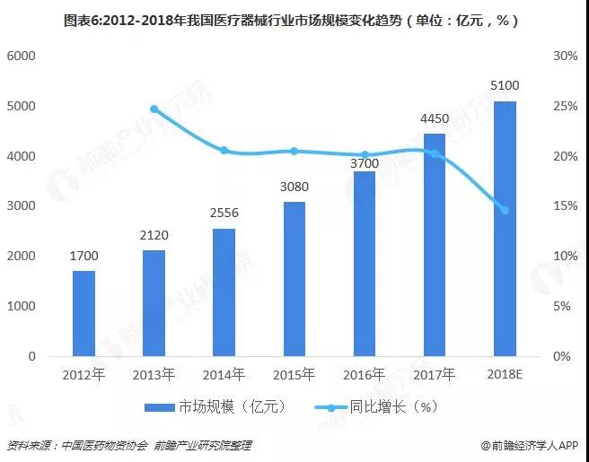 隨著我國經濟的不斷發展以及生活水平的不斷提高,人們對醫療保健的意識逐漸增強,因此對于醫療器械產品的需求也在不斷地攀升,再加上我國正逐步進入老齡化社會和政策對于醫療器械這個行業的支持,使得我國醫療器械市場規模從2012年1700億元快速增長到2017年的4450億元,預計到2018年我國醫療器械行業市場規模將達到5100億元。對比國際市場,顯然我國醫療器械市場還有巨大成長空間。