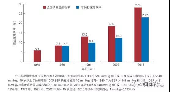 在1958~1959年、1979~1980年、1991年、2002年和2012~2015年進(jìn)行過5次全國范圍的調(diào)查,顯示中國高血壓患病率呈現(xiàn)上升趨勢。