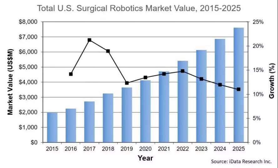美國手術機器人2025年預計市場有規模較2015年相比增長近四倍