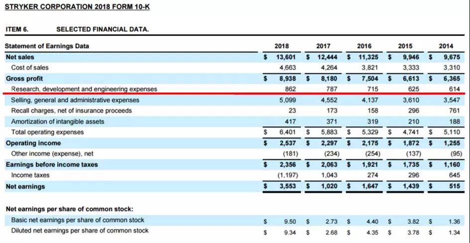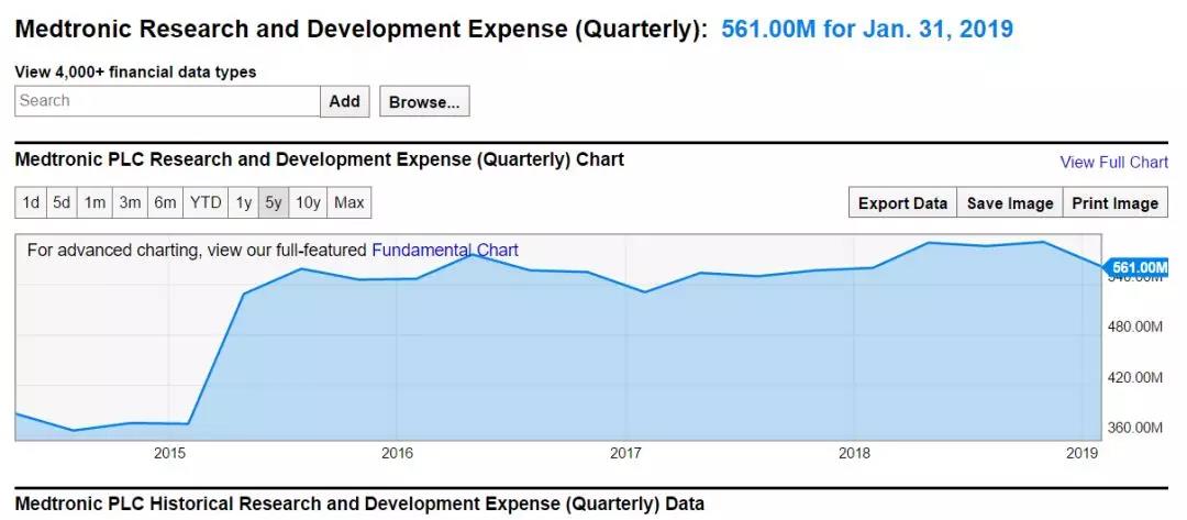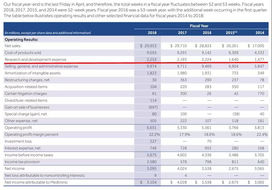 美敦力在2018年報中明確表示,“今年4%收入增長速度得益于對手術機器人、二尖瓣置換、個人糖尿病設備等高增長技術市場的投資”以及“將持續關注以技術為重點的小型互補或并購交易”。美敦力在2018年R&D總投入為22.53億美元,第四季度R&D投入為5.61億美元,預計2024年R&D總投入將增長至27億美元,凈銷售額從299億美元增長至389億美元[2]。