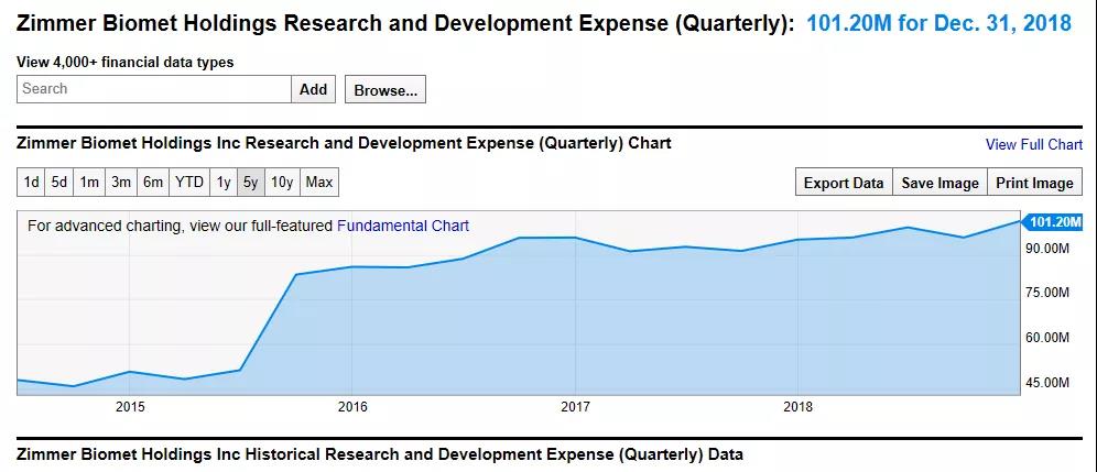 Stryker為了鞏固其骨科行業巨頭的地位,在2013年以17億美元收購了以色列外科手術機器人公司MAKO Surgical,并在2015年推出了第三代MAKO System,升級版的MAKO System是整合了Stryker提供的植入物和MAKO平臺。2016年Stryker將自己旗下的全膝關節置換術系統Triathlon Total Knee System與MAKO System 結合推出了第一代全膝關節置換平臺MAKO TKA,最近幾年推出的關節置換術還有涉及到肩關節、肘關節、踝關節、腕關節和手指關節。據Stryker 2018年報顯示,公司銷售凈收入為136.01億美元,R&D投入為從2011年的4.62億美元上升至8.62億美元,18年研發強度約為6.3%,2018年第四季度R&D投入為2.21億美元,而2015年第四季度R&D投入僅為1.53億美元[5]。