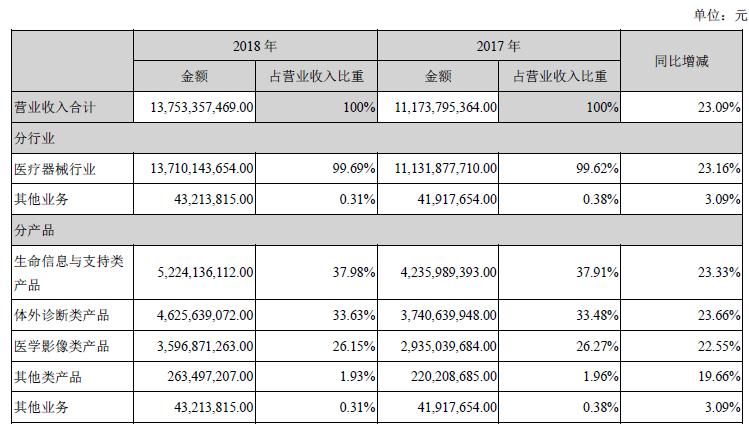 從營收結構來看,醫療器械行業的業務收入占企業總營收的99.69%。其中主要有三類業務的收入構成,分別是“生命信息與支持類產品”、“體外診斷類產品”和“醫學影像類產品”, 營收占比分別是37.98%、33.63%和26.15%,它們實現的營業收入分別為52.24億元、46.26億元和35.97億元,同比增長23.33%、23.66%和22.55%。