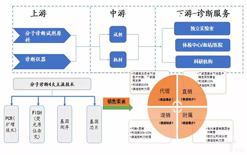分子診斷產業鏈上游主要是原料供應商,包括診斷酶、引物、反轉酶、探針等生物制品、高純度氯化鈉、無水乙醇等精細化學品以及提取介質材料;中游主要是診斷儀器耗材和試劑供應商包括羅氏、賽默飛、達安基因、科華生物、之江生物等,下游主要是使用儀器或試劑的用戶,包括醫院、第三方醫學實驗室、血站、體檢中心等。