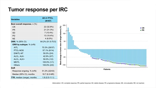 此外,不同組織學亞型的ORR均表現出較好的療效,如血管免疫母細胞性T細胞淋巴瘤(AITL)的ORR為70.3%,PTCL非特指型(PTCL-NOS)的ORR為57.1%,鼻型結外NK/T細胞淋巴瘤(ENKTL-NT)的ORR為50.0%,間變性大細胞淋巴瘤(ALCL,ALK-)的ORR為42.9%,ALCL(ALK+)的ORR為50.0%,單形性親上皮性腸道T細胞淋巴瘤(MEITL)及其他亞型的ORR均為100%。