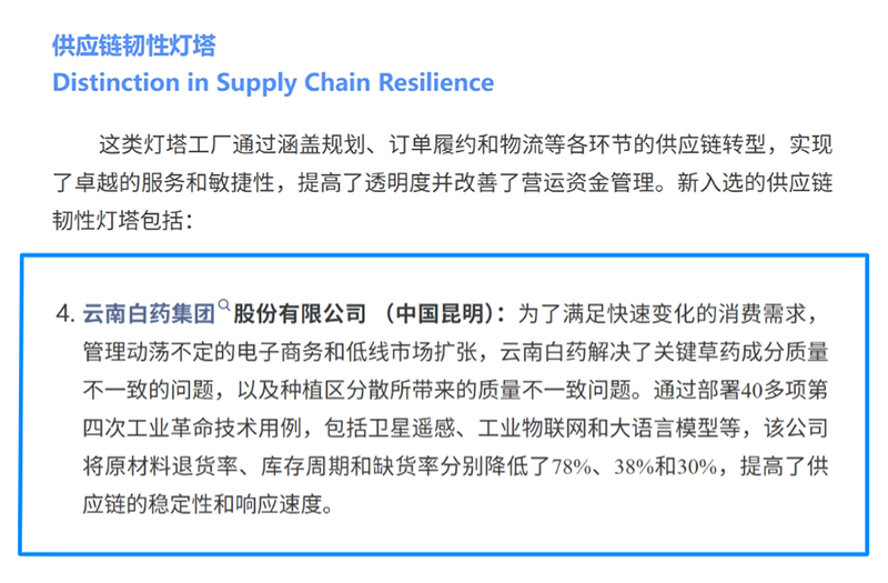 云南白藥從傳統中藥制造企業到如今擁有先進智能制造體系、獲國際認證智慧型企業,其轉型歷程正是民族品牌從“傳統制造”向“智能制造”升級的縮影。世界經濟論壇將“燈塔工廠”定義為“數字化制造與工業4.0的示范者”,此次云南白藥智慧工廠的入選,意味著其在數字技術應用、管理模式上的實踐,已達到全球制造業智能化發展的前沿水平。